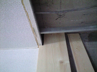 飼い木を天井に接着させるのは大変です。ねじ止めがイヤなので、下から支えなければいけません。